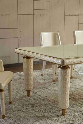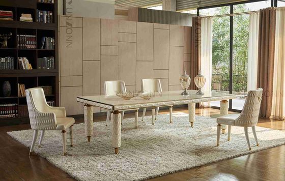 Обеденный стол с белизной крышки вышивки кожаной закалил стеклянный верхний железный каркас нержавеющей стали для дома