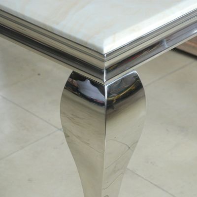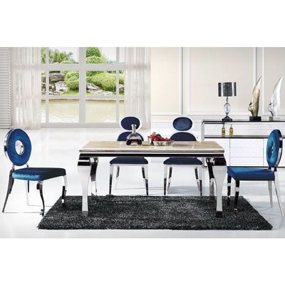 Обеденный стол главным образом простого дизайна, соответствующий для приобретения в доме. Простой стиль прочен, не цвет цветка, но классический серебр нержавеющей стали как главный цвет. Столешница может выбрать использовать мрамор или панель MDF. Этот стиль всегда был куплен в больших количествах главными торговцами мебели.