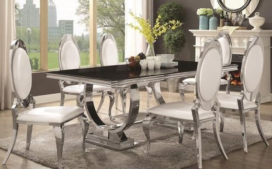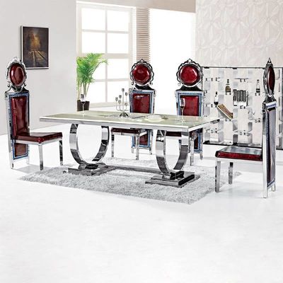 Обеденный стол главным образом простого дизайна, соответствующий для приобретения в доме. Простой стиль прочен, не цвет цветка, но классический серебр нержавеющей стали как главный цвет. Столешница может выбрать использовать мрамор или панель MDF. Этот стиль всегда был куплен в больших количествах главными торговцами мебели.